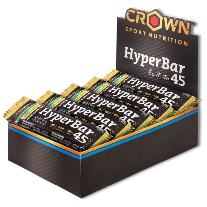 Dentro de esta línea tenemos HyperBar 45, que es la adaptación a formato gominola de nuestro HyperGel 45. Por lo tanto, se trata de una barrita doble de 60 g (2×30 g por envase) de la más alta calidad y con una composición ideal de hidratos de carbono, cafeína y sodio, nutrientes necesarios para mejorar el rendimiento tanto de los entrenamientos como de las competiciones de larga duración. En esta barrita doble tendrás 45 g de carbohidratos (realmente 46,1 g), 80 mg de cafeína y un aporte extra de Sodio (aprox. 165 mg).
